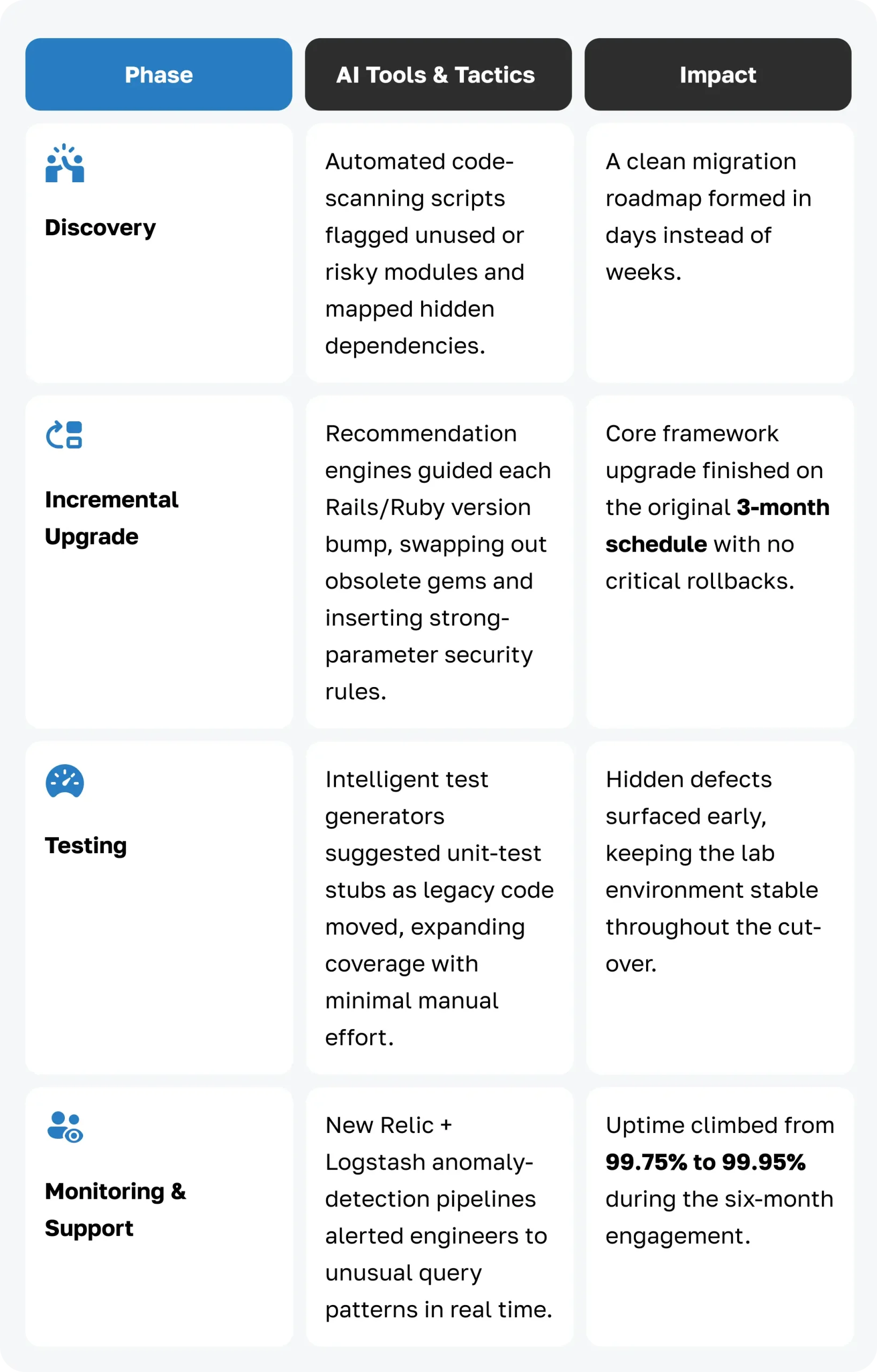 Before the transition, production defects averaged 6.2 per 1000s lines of code. With AiQA guarding every commit, the rate dropped to 4.7 — a 24% improvement — while sustained uptime rose from 99.75% to 99.95%. Your users feel the difference in stability, not just speed.